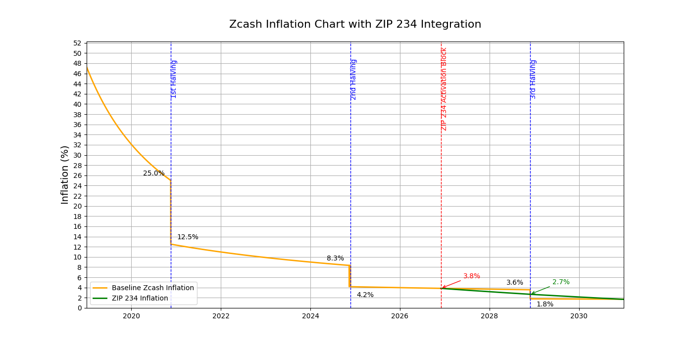 Like Bitcoin, Zcash began its first year with an annualized inflation rate of 48%. During the first halving, after four years of life, the pace of inflation dropped from 25 %/yr to 12.5 %/yr. In November 2024, the second one of these events happened, further lowering the 8.3%/yr to the current 4.2%/yr—the same inflation the US experienced in the previous year.
