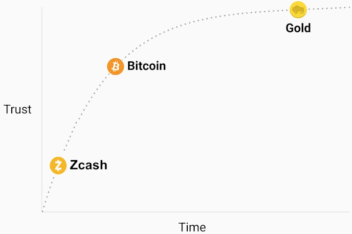 | Property | Zcash | Bitcoin | Gold | Fiat |